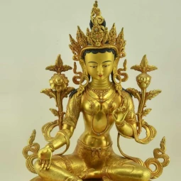Fully Gold Gilded 19.5″ Green Tara Sculpture, Hand Face Painted, Fire Gilded 24K Finish